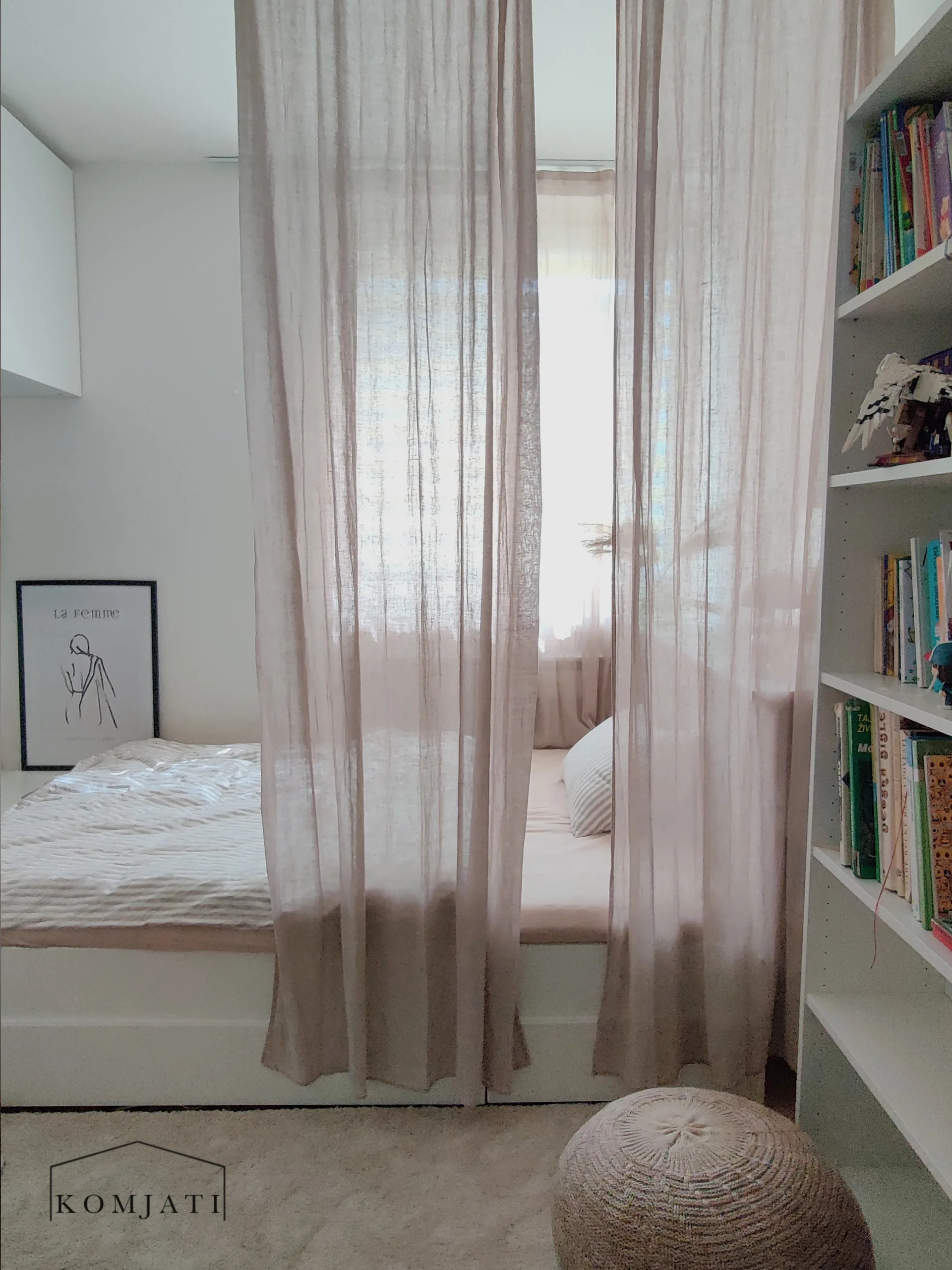 Postel jsme nepodcenili a vybavili ji šuplíky a úložnými boxy na dosah z postele, kam si může schovávat tajnůstky, nebo přinejmenším peřiny a polštáře. Zatímco jsme postel oddělili lněným závěsem pro soukromí, vznikl tak volný prostor pro chundelatý koberec a pufy pro návševu.